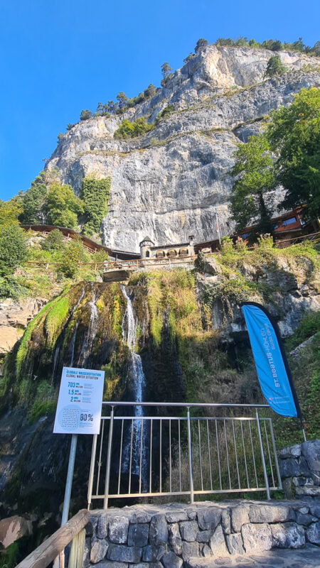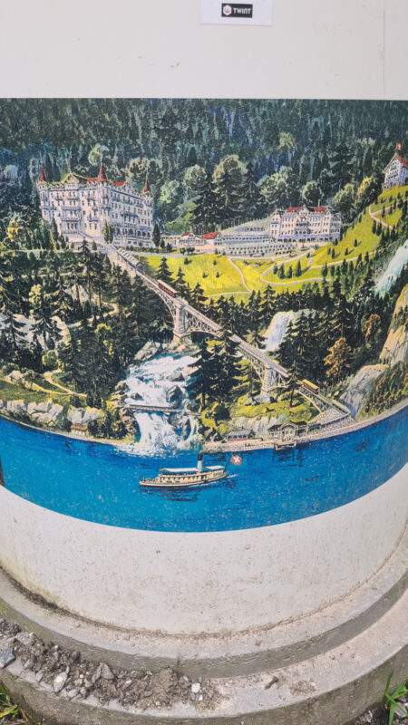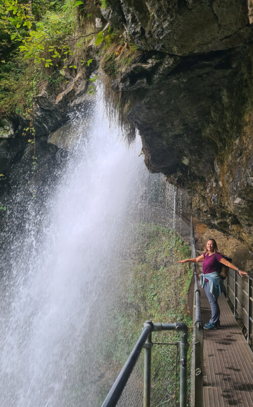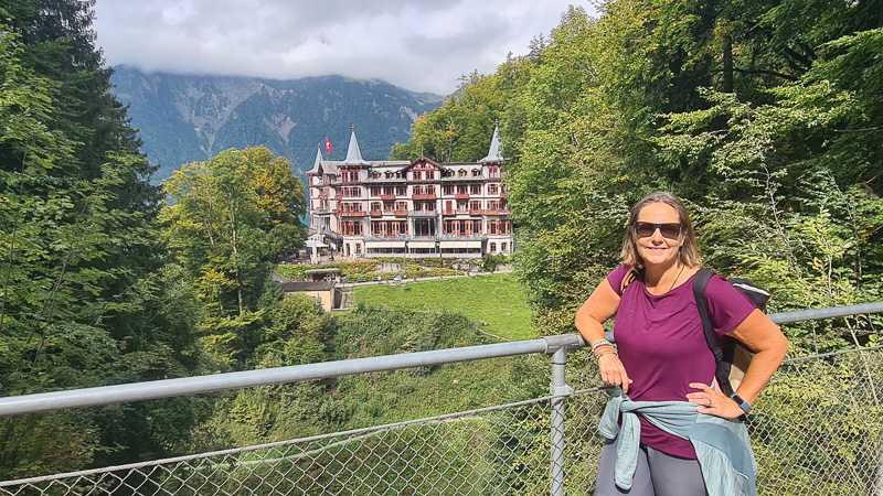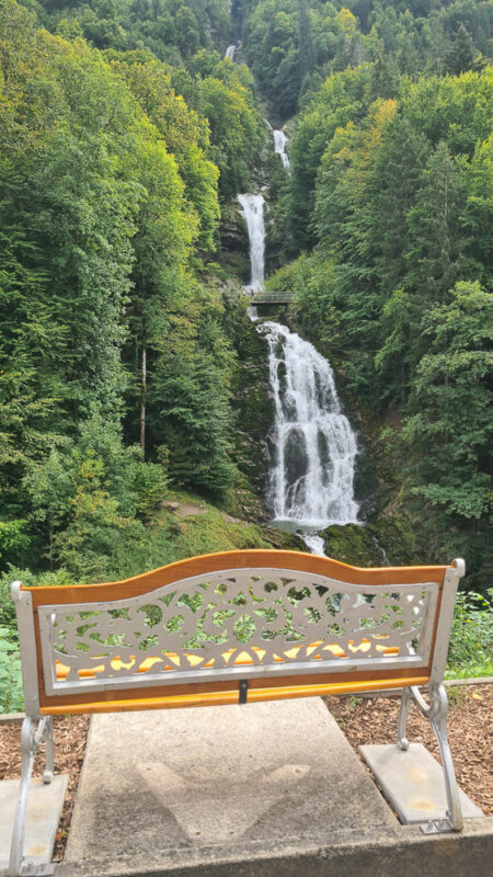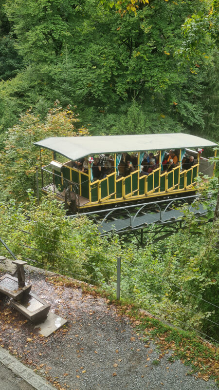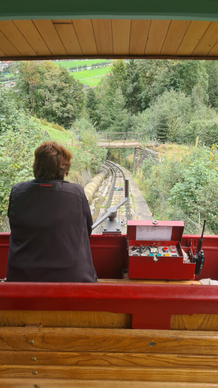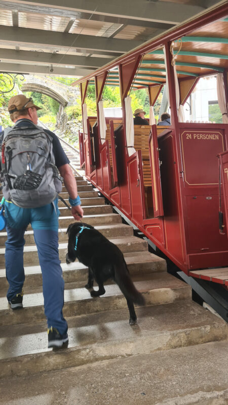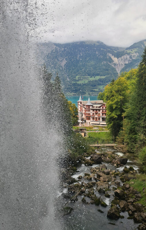 Aber es kommt noch besser: Es folgen viele Foto-Spots entlang der Wasserfälle bis ganz hinauf und unterwegs spazieren wir sogar – wie im Lauterbrunnental – direkt unter und hinter dem Wasserfall hindurch. Ein Spektakel, das ich ganz besonders genieße. Wir nehmen uns Zeit, um auf der Terrasse des immer noch belebten Grand Hotels einen Schweizer Cidre („Suure Moscht“) zu trinken und natürlich spaziere ich auch durch die Salons, das Foyer und besehe das Restaurant. Seit 1879 verbindet auch die älteste touristische Standseilbahn Europas die Schiffsstation mit dem Hotel.