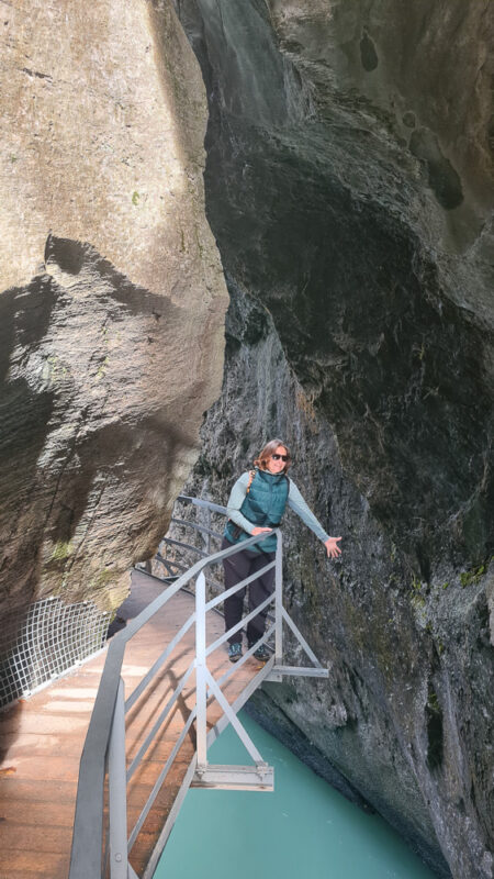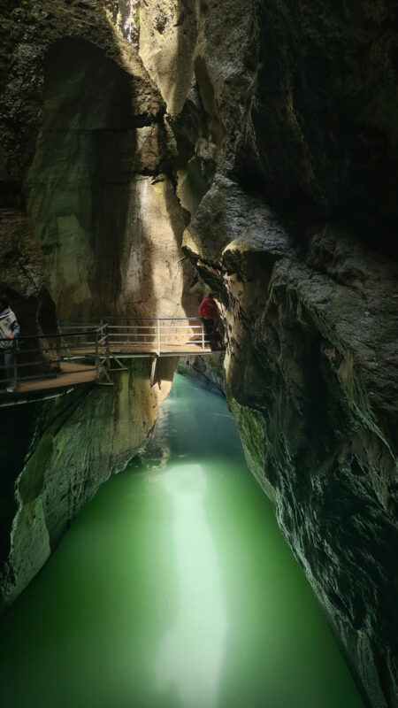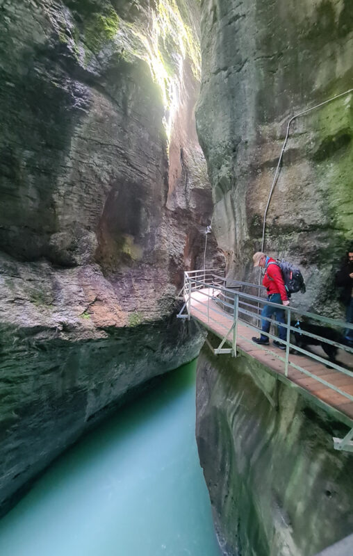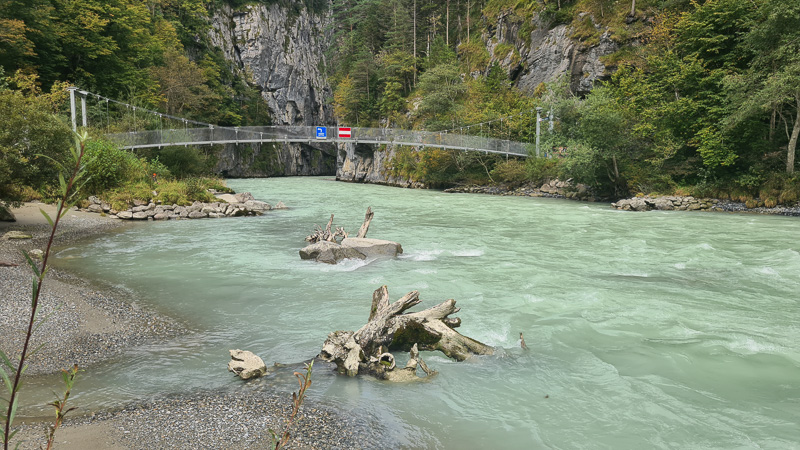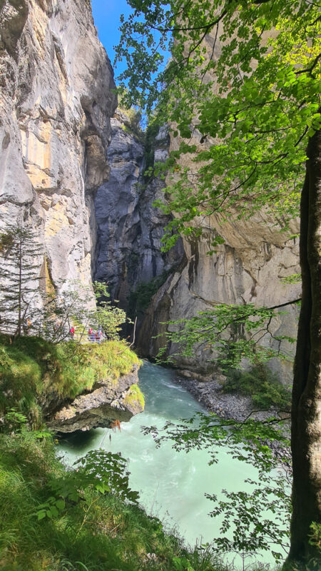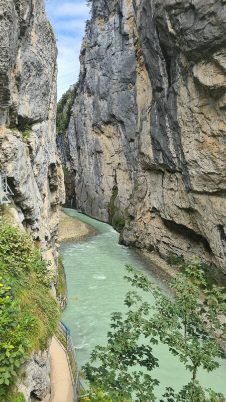 In Zehntausenden von Jahren hat die Aare sich durch den Kalkfels im Haslital gegraben und eine 1400 Meter lange Schlucht geschaffen, die seit 1888 für uns Besucher erschlossen ist. An der engsten Stelle ist die Felsspalte gerade mal einen Meter breit, während die Wände bis zu 180 Meter in die Höhe ragen – ein Naturspektakel, das wir auf Stegen und durch Tunnel erwandern. Wir brauchen mal wieder doppelt so lang für die Tour, denn: Fotomotive en masse! Dazu das Rauschen und die Farben – der Sonneneinfall zur Mittagszeit ist im Herbst gerade optimal zum Fotografieren.