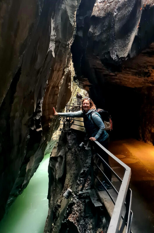 Die Aareschlucht stand schon lange auf meinem Schweizer Wunschprogramm. Während unserer Camping-Tour durch das Berner Oberland wurde die Schluchtenwanderung endlich auch für mich wahr. Für Campervans und WOMOs gibt es – jetzt zur Herbstsaison – reichlich Parkplätze, das ist angenehm. Nach der Kassa mit dem Shop geht es erst gemütlich über grüne Wiesen, bis die Klamm eng und immer enger wird.