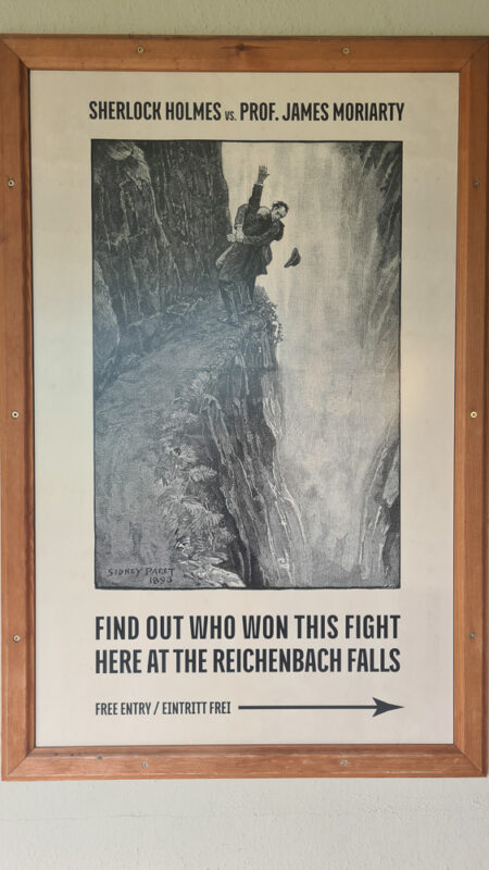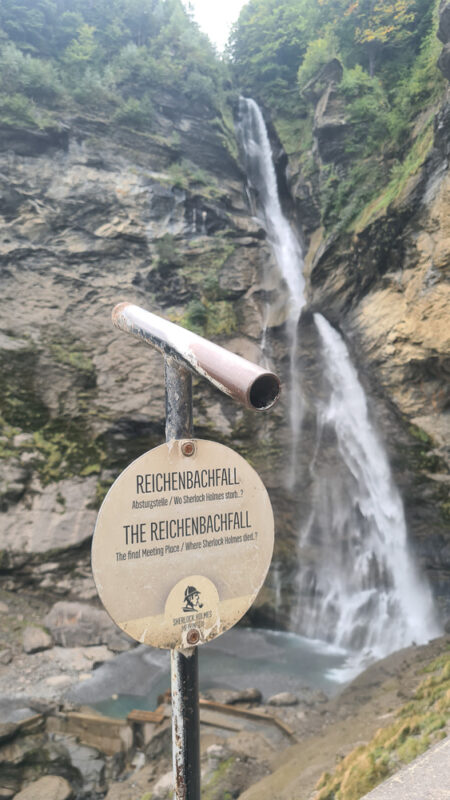 Gemütlicher gestaltet sich unser kleiner Ausflug zum „berühmten“ Reichenbachfall im schnuckeligen Meiringen: Der Wasserfall ist eine 300 Meter hohe Kaskade und wurde durch Arthur Conan Doyle berühmt, der dort seinen Sherlock Holmes „loswurde“: Während eines Kuraufenthalts stürzt Holmes hier im Kampf mit seinem Erzfeind Professor Moriarty in die Tiefe. Wir fahren mit der nostalgischen Standseilbahn von 1899 hinauf zum Wasserfall, wo eine Gedenktafel und ein weißer Stern die Stelle des legendären Kampfes markieren – ein Muss für jeden Sherlock-Fan. Der Pfad führt hinauf zu mehreren Aussichtspunkten. Wir sind mit dem Campingbus unterwegs und parken auf einem der großen Parkplätze auf dem Weg zur Aareschlucht.