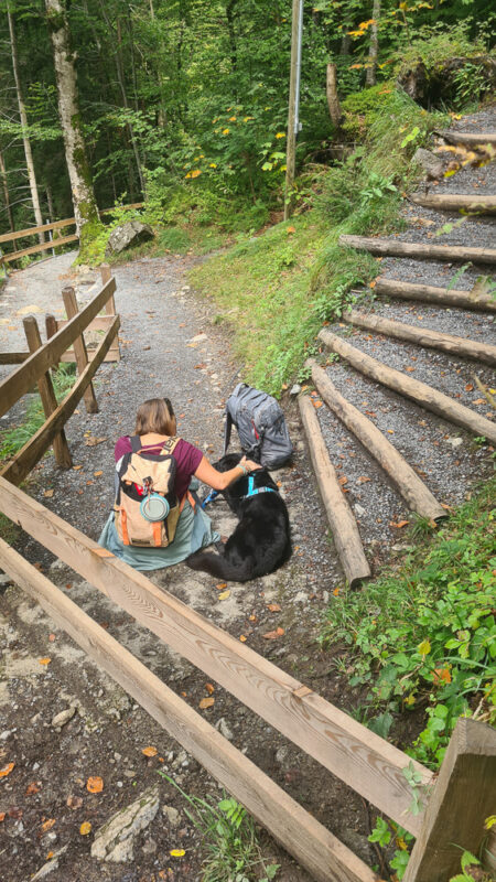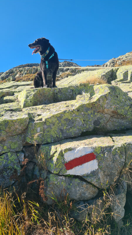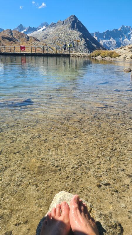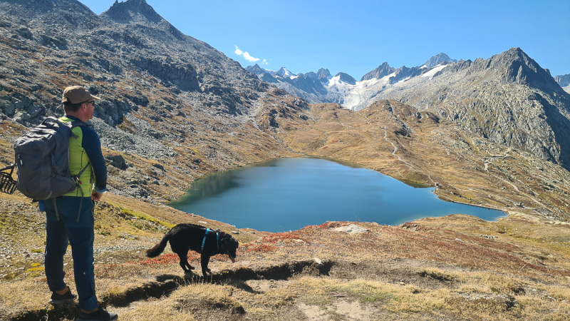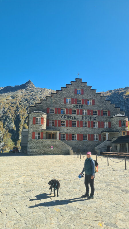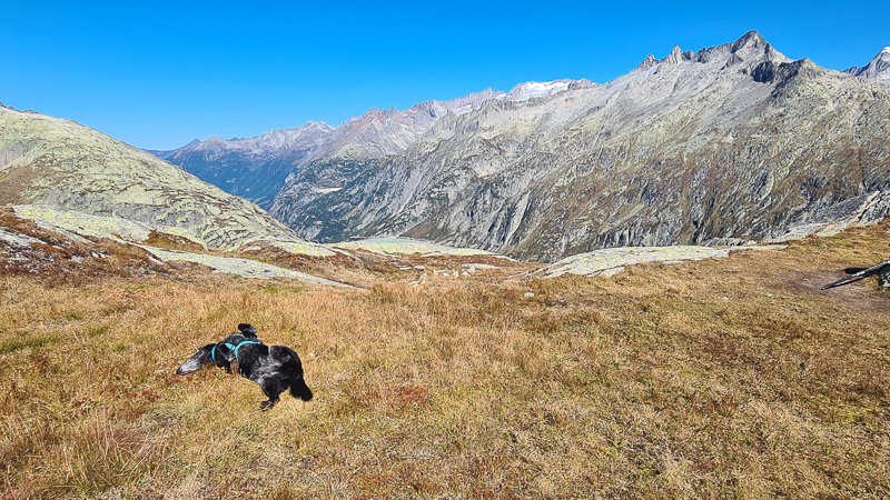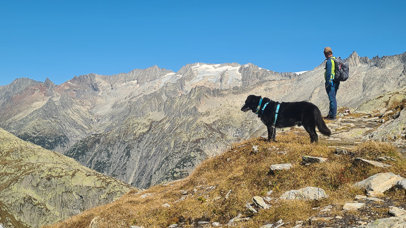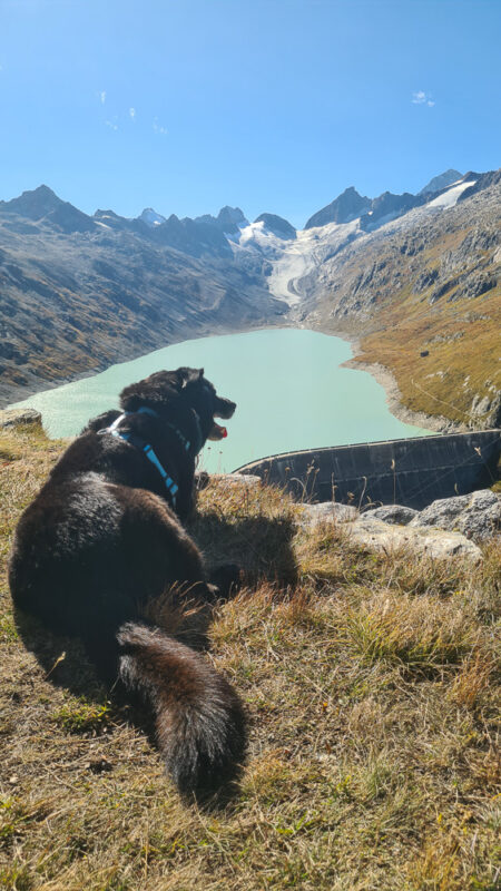 Von dort startet unsere Bergtour steil bergauf: Eine Wanderung mit Aussicht auf die karge und grandiose Naturlandschaft des Grimselgebiets. Wir sehen die Eismassen des Rhone- und des Oberaargletschers, erfrischen uns im idyllischen Triebtenseewli, es öffnet sich der Blick ins UNESCO Welterbe der Schweizer Alpen Jungfrau-Aletsch und es folgt der letzte – wieder steile – Abstieg zum Oberaarsee. Tapfer hält sich unser Senior-Hund bis zur letzten Gondelfahrt retour, die uns direkt über den Grimselsee führt – Hier halten wir alle den Atem an, als das Grimsel-Hospiz auf seinem Felsen wieder näher kommt und wir unsere Gondel als Schatten im See hoch droben sehen.
