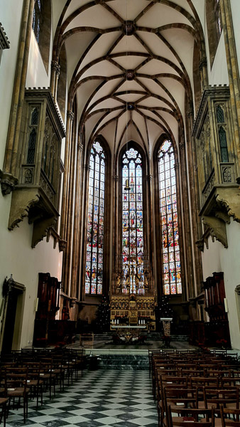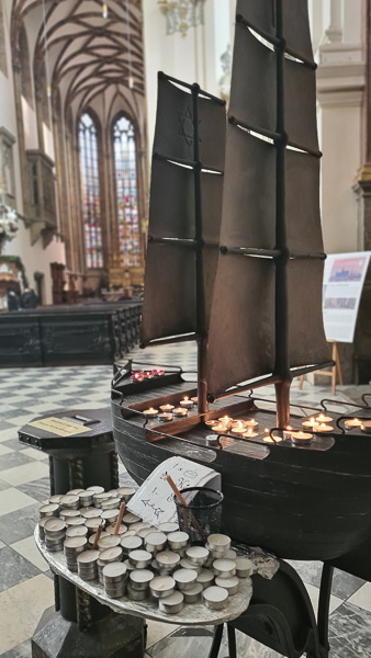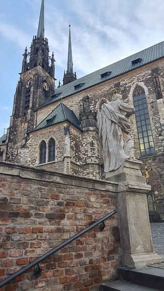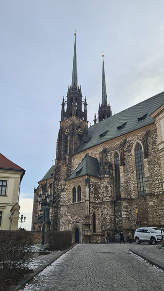 Die Kathedrale thront auf dem Petrov-Hügel und prägt die Skyline von Brünn. Der Aufstieg ist schnell erledigt und die Aussicht auf die Stadt entschädigt. Die Kathedrale selbst ist von innen sehenswert – neugotischer Stil, beeindruckende Gewölbe, barocke Elemente. Was viele nicht wissen: Die Kirchenglocken läuten mittags bereits um 11 Uhr – siehe astronomische Uhr: Beides geht auf eine Legende aus dem Dreißigjährigen Krieg zurück, als die schwedischen Belagerer versprachen, abzuziehen, falls sie die Stadt bis Mittag nicht einnehmen konnten. Der Glöckner läutete einfach eine Stunde früher – und die Schweden zogen tatsächlich ab. Diese Story hat uns auch die supernette und hundefreundliche Dame bei der Tourist-Info so erzählt…