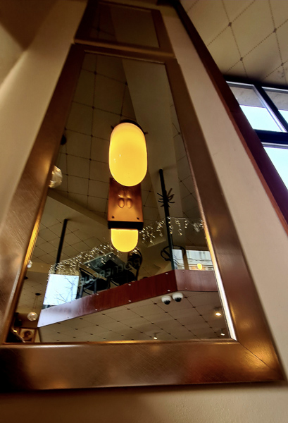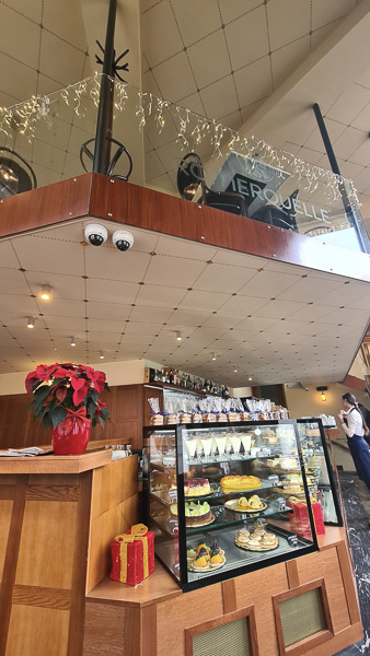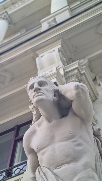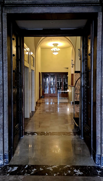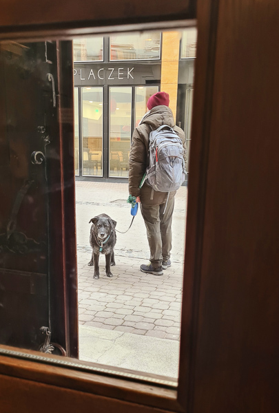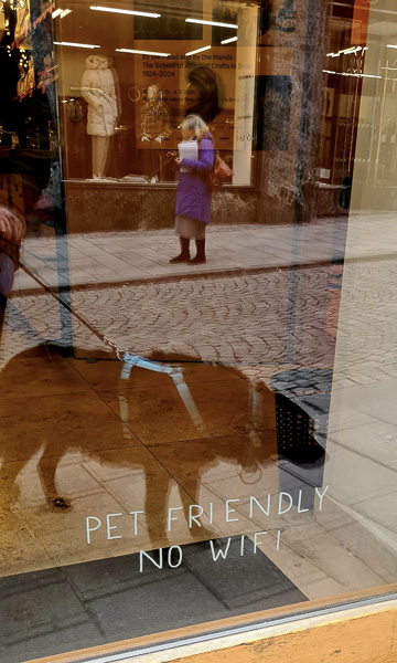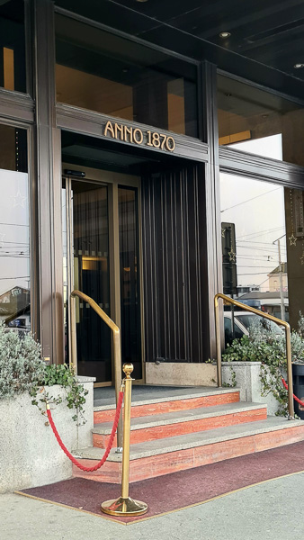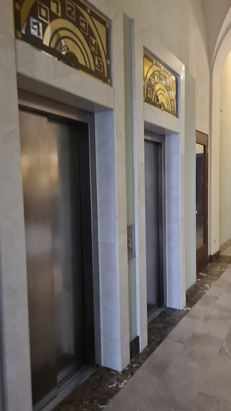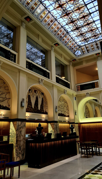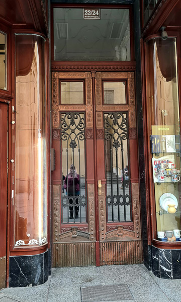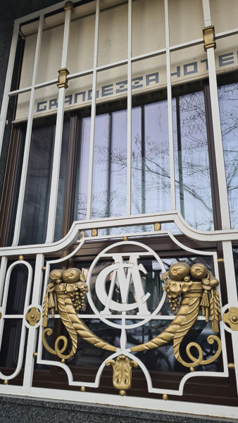 Ein wenig reingelugt habe ich ins formidable Foyer, aber leider mehr war nicht drin. Aber: Wir sind ins schöne Jugendstil Café direkt im Hotel auf Straßenebene für einen guten Kaffee eingekehrt und auch zum Aufwärmen: Sehr freundliche Bedienung – auch für Hund Coffee war ein frisch gefüllter Wassernapf drin.