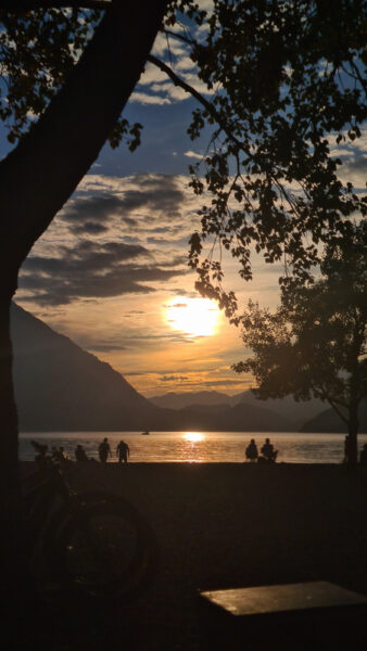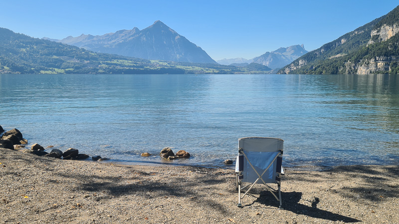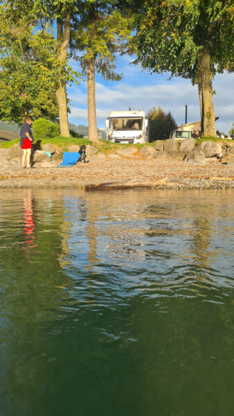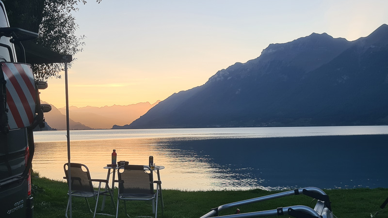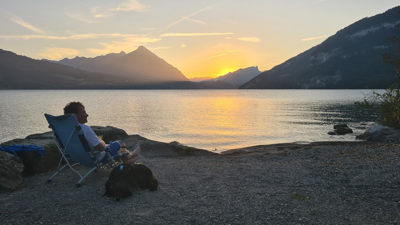 Die erste Reihe an Stellplätzen direkt am Brienzersee am Familiencamping Aareg ist ganz besonders begehrt – Kunststück, denn: Man hat nicht nur den See direkt zu seinen Füßen vor dem Campervan, sondern genießt auch von hier aus täglich seinen ganz persönlichen superromantischen Sonnenuntergang. Wir anderen packen einfach unseren Campingsessel, den Hund und einen Apéro und pilgern zum schönen Schotterstrand: Dort sind wir nicht alleine. Alle Camper wollen den sagenhaften Sunset-Ausblick über dem See genießen, wir legen sogar noch ein abendlichen „Schwumm“ ein.