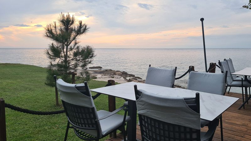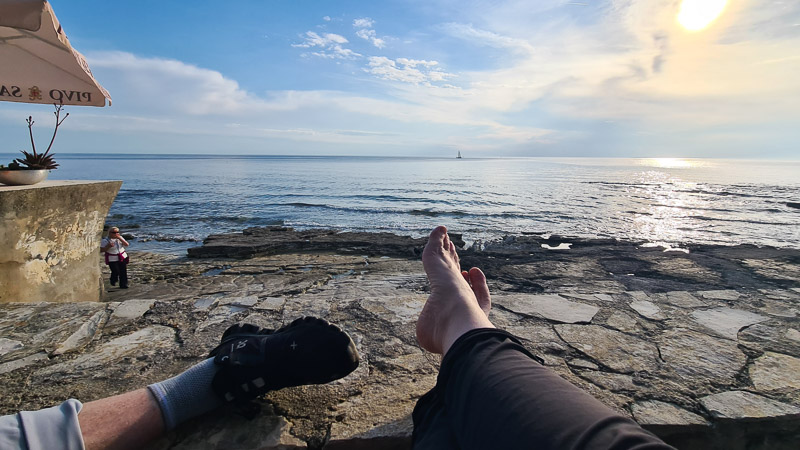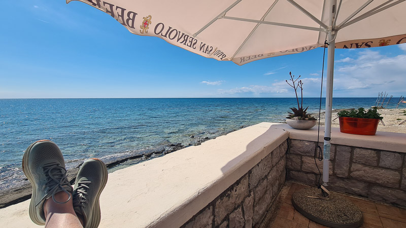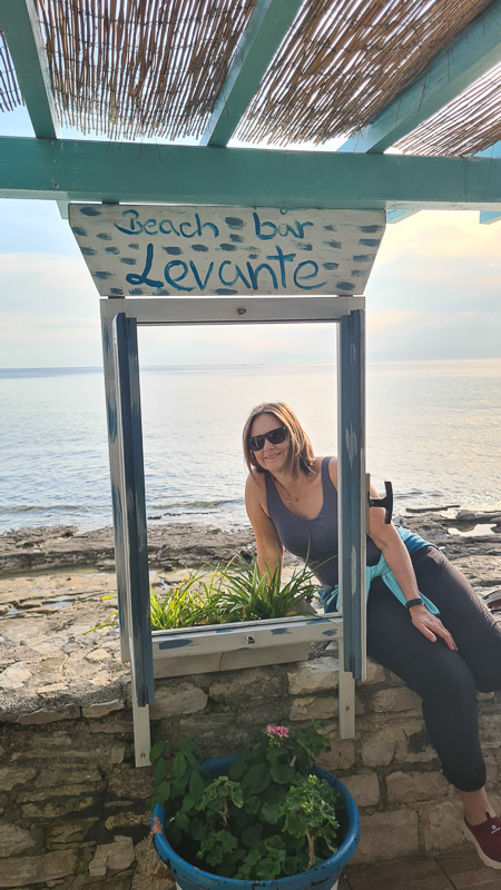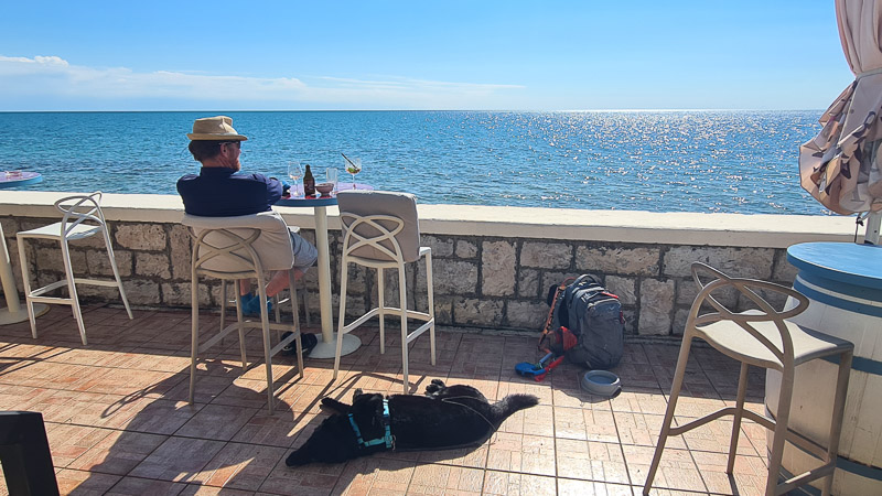 Ein offizieller Hundestrand liegt gleich nach dem Leuchtturm beim Istra Camping Savudrija, dieselbe Promenade führt weiter zur Levante Bar und was soll ich sagen: Selten so eine schöne Bar, so freundliches Service und so einen traumhaften Ausblick erlebt. Hunde herzlich willkommen. Haben wir weidlich ausgenutzt – danke! Achtung, Montag geschlossen!