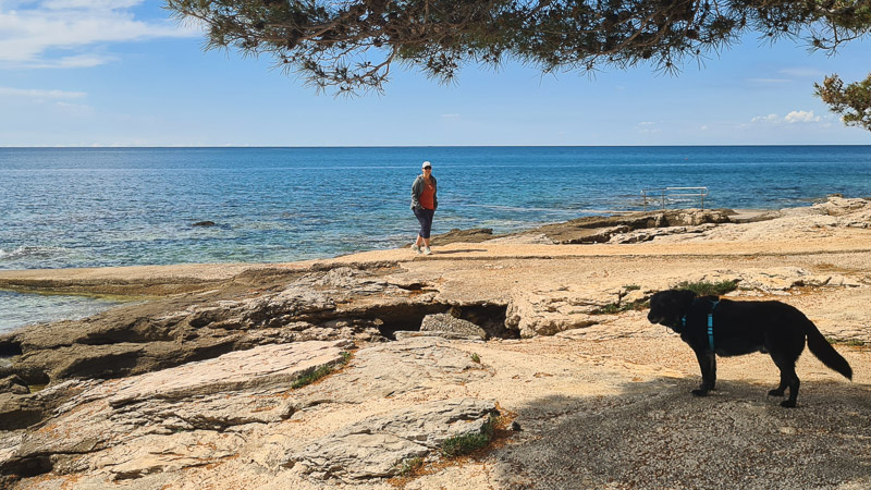 Im April hatte gefühlt jeder einen Vierbeiner mit dabei und nachmittags hatte an der Rezeption Irish Setter Rudi Dienst (ein entzückender und freundlicher Rüde). Bezahlt haben wir für den Hund nichts. Gassirouten starten direkt vom Stellplatz Richtung Leuchtturm und Campingplatz Savudrija sowie in die andere Richtung – in der Nebensaison alles kein Problem: In der Hochsaison sicher nicht so easy.