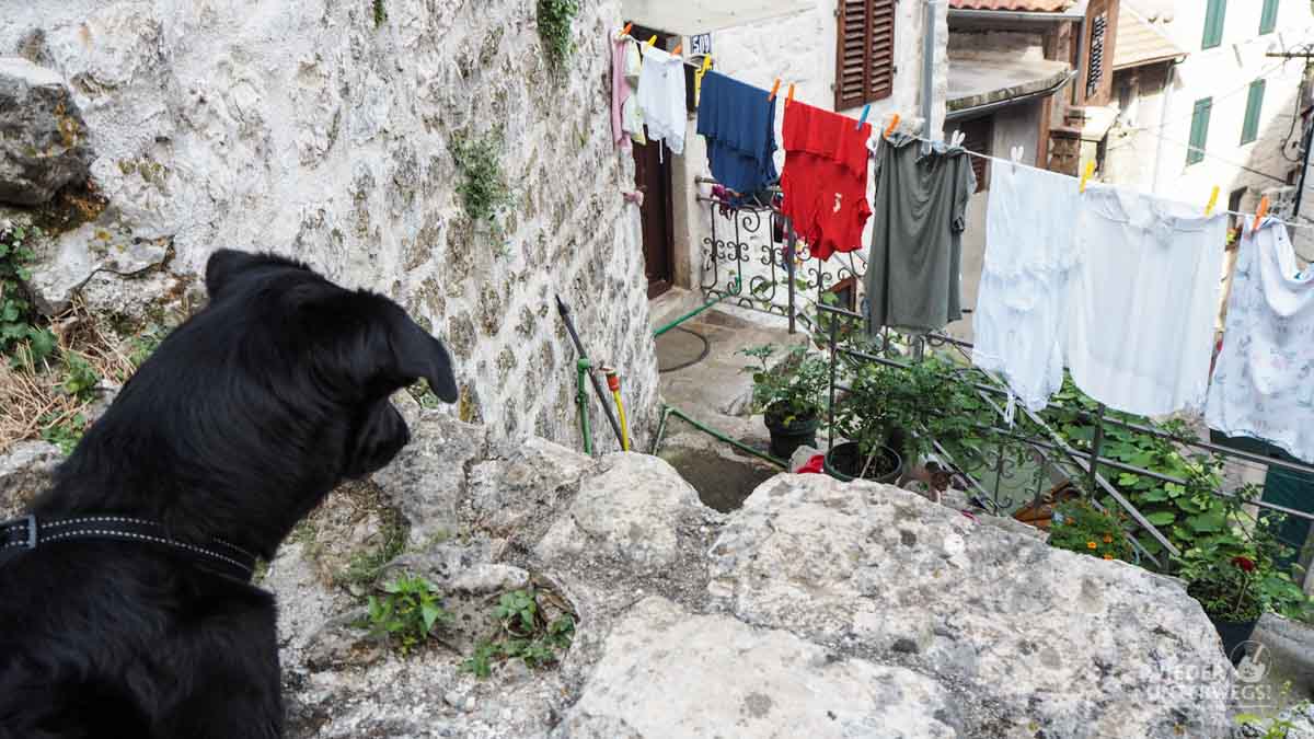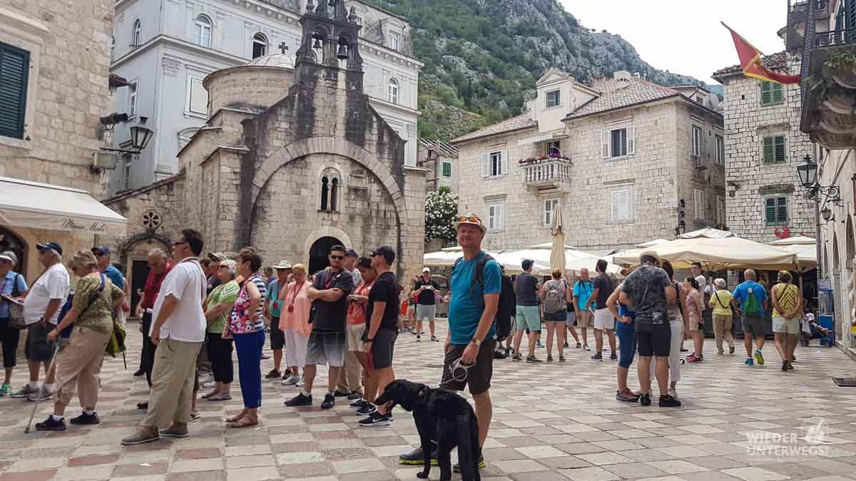 Wer sich Kotor mit dem Auto nähert (Parkplätze gibts u.a. bei der Westeinfahrt, wenn man früh genug kommt. Wir haben schattig hier geparkt…), sieht nur noch mehr Autos, Campervans, Menschenmassen und Kreuzfahrtsschiffe. Die pittoreske Lage lässt sich von unten nur erahnen – auch wenn man zuvor die Bucht ausgefahren ist. Der Aufstieg auf die Burg war ein Muss – aber den würde ich wirklich nur frühmorgens empfehlen, wenn die Kreuzschiff-Touristen noch beim Frühstück sitzen. Ansonsten wird es für Mensch und Hund nur zur Tortur (wir waren im Juni unterwegs). Achtung, die Katzen von Kotor sind berühmt – aber nicht wegen ihrer Schmusigkeit. Die sind hervorragend organisiert!