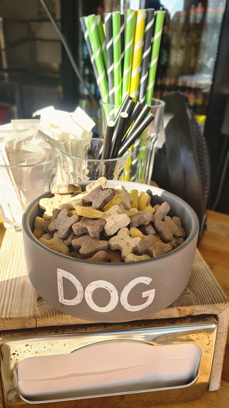 An der Rezeption kann frisches Frühstücksgebäck bestellen, ein Wassernapf wartet auf die eincheckenden oder vorbeispazierenden Vierbeiner und drinnen gibts freundliche Worte und viel Informationsmaterial.