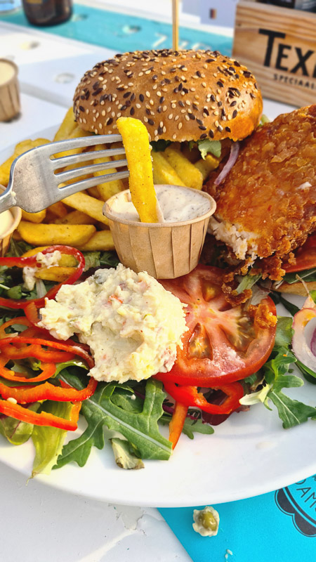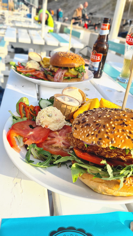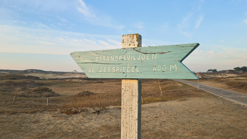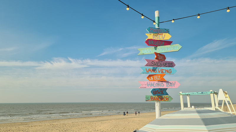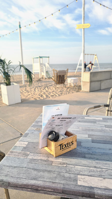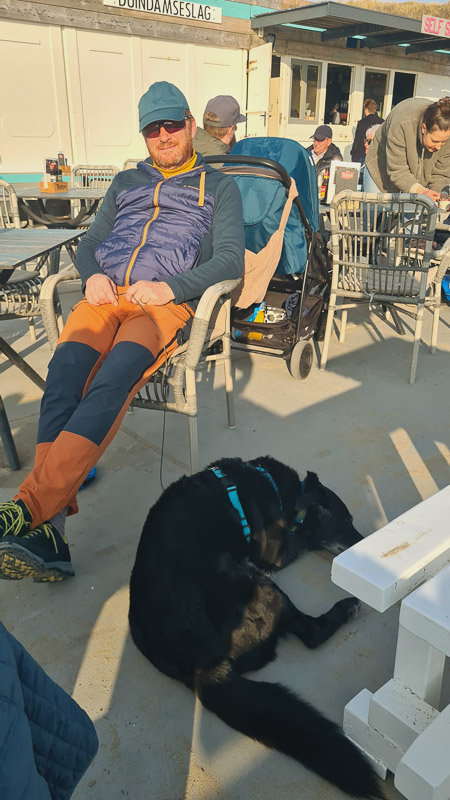 Danach gabs noch ein Bierchen, das eine oder andere Leckerli für den Vierbeiner und einen kleinen Rundgang auf der Terrasse vom Zeespiegel: Wenn die Sonne scheint, ist sie schnell gut gefüllt und ein bisschen fungiert sie auch als Fotolocation: Mit Wegweiser, Schaukel und Sitzplätzen für die Füße im Sand.