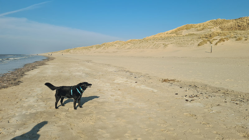 Südlich von Afrit 1 liegt der de ganzjährige, leinenfreie Hundestrand Richtung Katwijk, etwa vier Kilometer, ohne Leine, die ganze Saison. Wer mit Hund im März unterwegs ist wie ich, hat für sich und den Vierbeiner schlicht das gesamte Strand-Angebot zur Verfügung. Und das ist wirklich, wirklich viel.