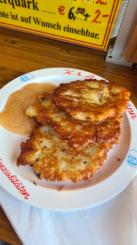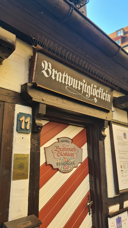 Schäufele mit Sauerkraut (Schweinsschulter), saure Zipfel und fränkische Bratwürste dominieren die Speisekarten in Nürnberg. Saure Zipfel – oder Blaue Zipfel – sind rohe Bratwürste, die in einem Essigsud mit Zwiebeln, Weißwein und Gewürzen gekocht werden. Dabei laufen sie leicht bläulich an. Die fränkische Küche ist deftig, wie man sieht. Ich persönlich hab mich in Nürnberg auf die kleinen Bratwürstel „spezialisiert“…