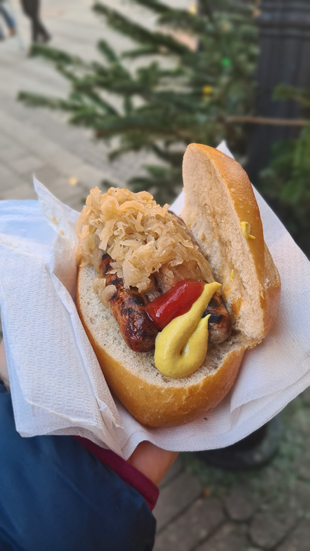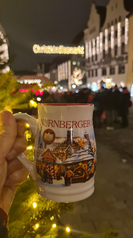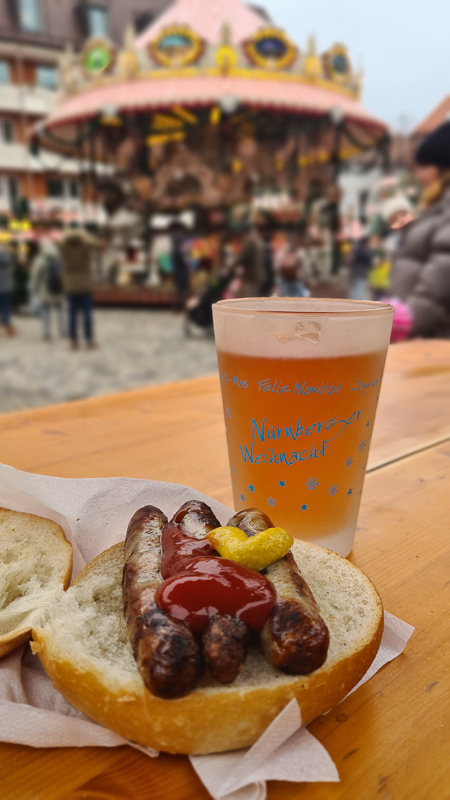 Die Nürnberger Rostbratwurst gehört hier unbedingt dazu, die „Drei im Weggla“ „gibt es an zahllosen Wurst-Ständen. Manchmal gibts ein Schaufele Sauerkraut, immer nimmt man Senf und Ketchup dazu. Der Glühwein kommt in Keramik- oder Glashäferln mit wechselndem Jahresmotiv – gegen Pfand kann man die Tasse behalten.