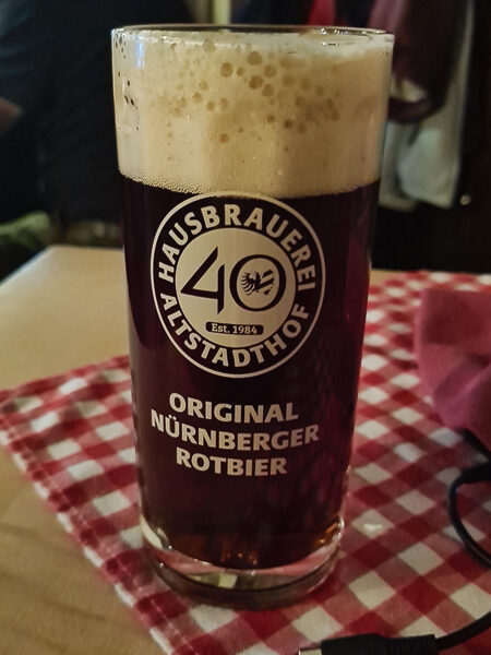 Das Original Nürnberger Rotbier wird in der Hausbrauerei Altstadthof nach historischem Vorbild gebraut. Die Brauerei liegt in den alten Kellergewölben unter der Nürnberger Burg, ich bin auf meinen Streifzügen unzählige Male vorbeigekommen, bis ich endlich ein Krügerl gekostet habe: Das Rotbier bekommt seine dunkle Bernstein-Farbe durch spezielle Röstmalze und schmeckt – vor allem nach einem langen Besichtigungstag – sehr herzhaft und süffig. Bis ins 18. Jahrhundert war Rotbier in Nürnberg das vorherrschende Bier, dann wurde es vom hellen Bier verdrängt.