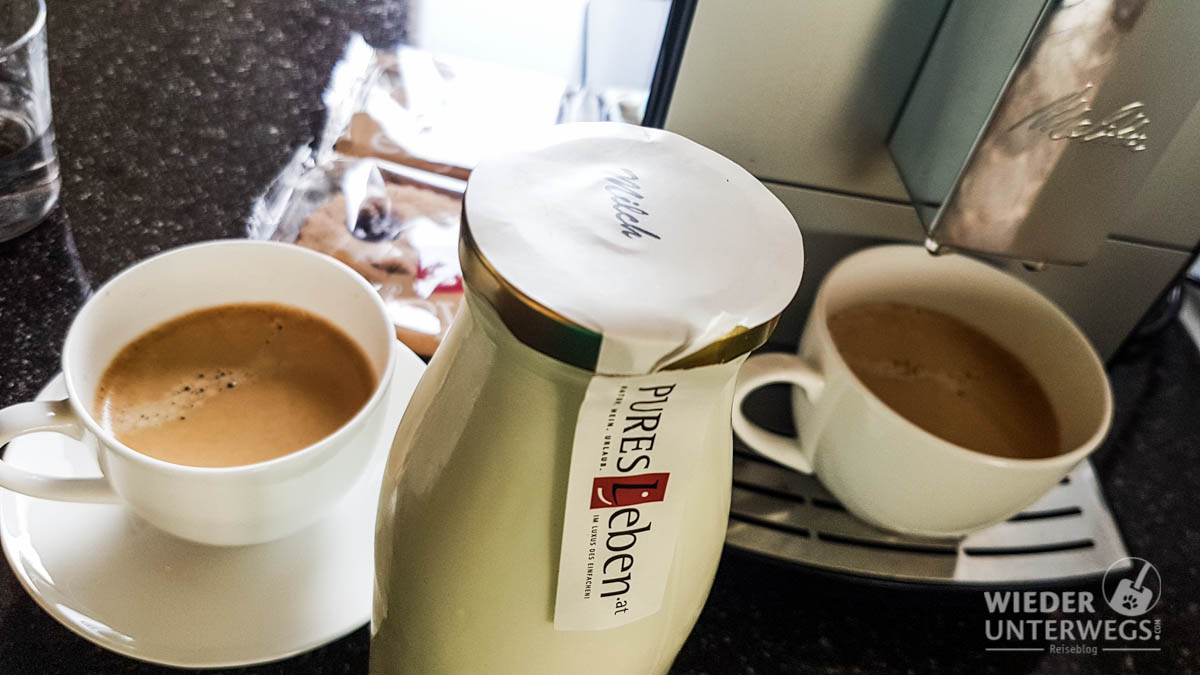 Unser Vorrat im Kühlschrank an Frühstücksutensilien, die bei Einzug auf uns warteten, reichten genau für zwei Mal morgendlichen Hunger. Nachbestellen kann man jederzeit und alles telefonisch bei den hiesigen guten Geistern, die auch den Frühstückskorb auf leisen Sohlen morgens vor die Tür stellen.
