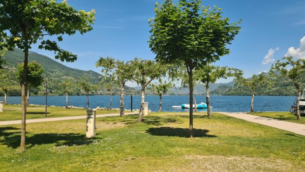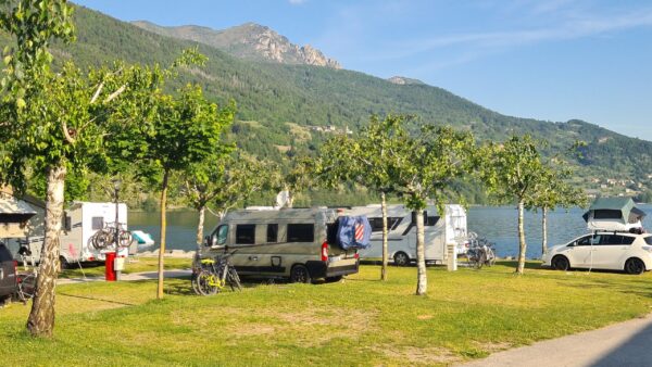 Wir stehen mit dem Camper auf einem kleinen, gepflegten Platz am Ostufer des Caldonazzosees: Camping Fleiola – für uns der schönste Campingplatz am Caldonazzosee. Ein paar Schritte führen direkt zum kleinen Kiesstrand, von dort aus geht’s weiter zur Brenta-Flussmündung, wo Einheimische und Hunde abends gemeinsam tratschen, pritscheln und spazieren. Die Stellplätze waren ungemein gepflegt, der Empfang professionell und herzlich und der Zugang zum Wasser 1a. Per Pedes ist man in drei Minuten beim Supermarkt und wer eine kleine Flussüberquerung nicht scheut, kann direkt vom Platz in die City und an der Promenade von Calceranica zum nächsten offiziellen Hundestrand oder zum Café direkt am See spazieren.