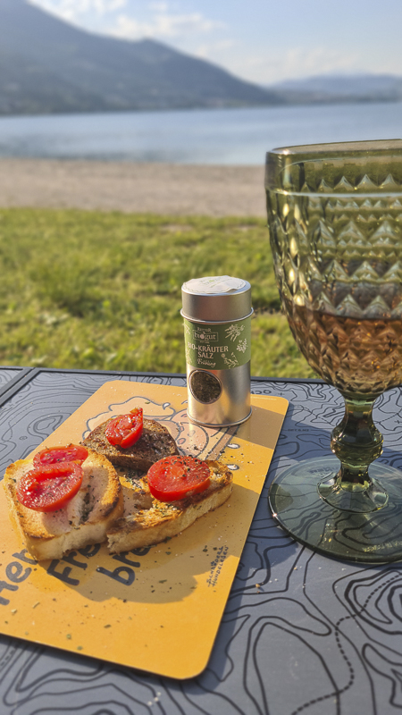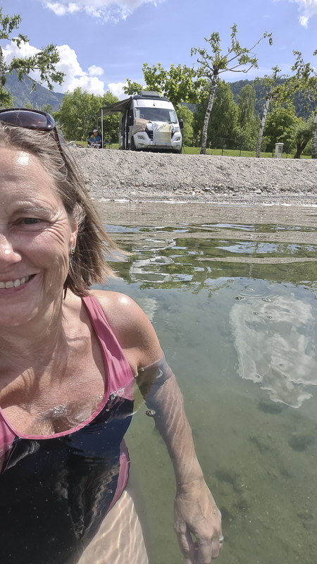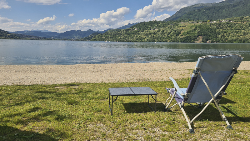 Zurück am Campingplatz Fleiola gefällt’s uns ohnehin am besten: keine Musik, keine Animation, dafür das Plätschern vom Wasser und die Berge im Hintergrund.