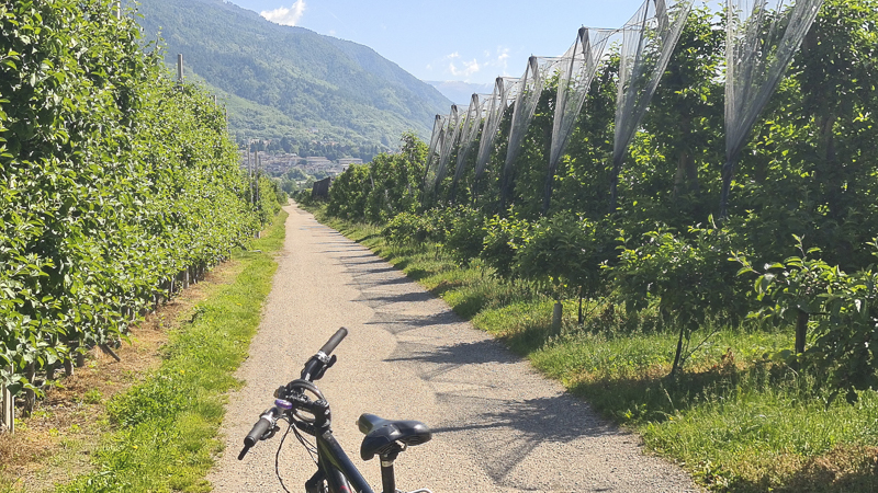 Der Radweg durch die Apfelplantagen startet ebenfalls fast vor der Campingplatztür. Hier muss ich aber dann doch raus auf die Straße zum Kreisverkehr (für Camper: kleiner, guter Shop in Gehentfernung zum Camping) und schon gehts rauf zum Radlweg, der hervorragend (!) ausgeschildert ist. Kurz nach dem Ort gehts dann auf autofreier Strecke durch die Ebene Richtung Levico, vorbei an Obstständen, kleinen Kapellen und duftenden Bäumen. Ideal auch für Fahrräder mit Hundeanhänger oder gemütliches Dahinrollen mit vielen Pausen – durch die Obstgärten, ein Traum.