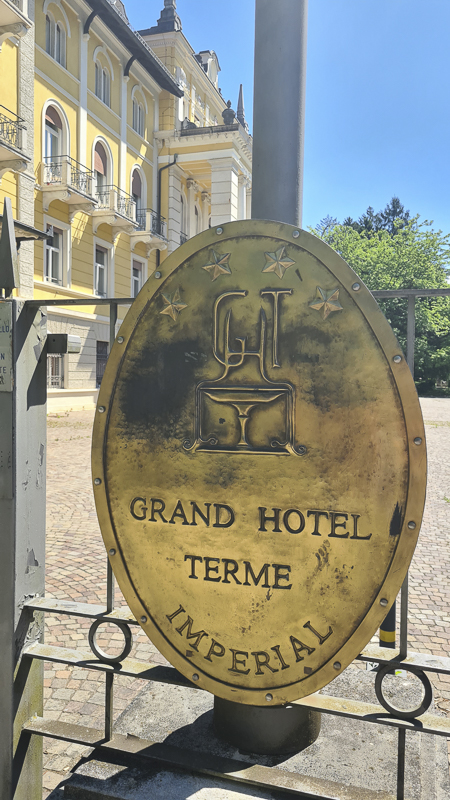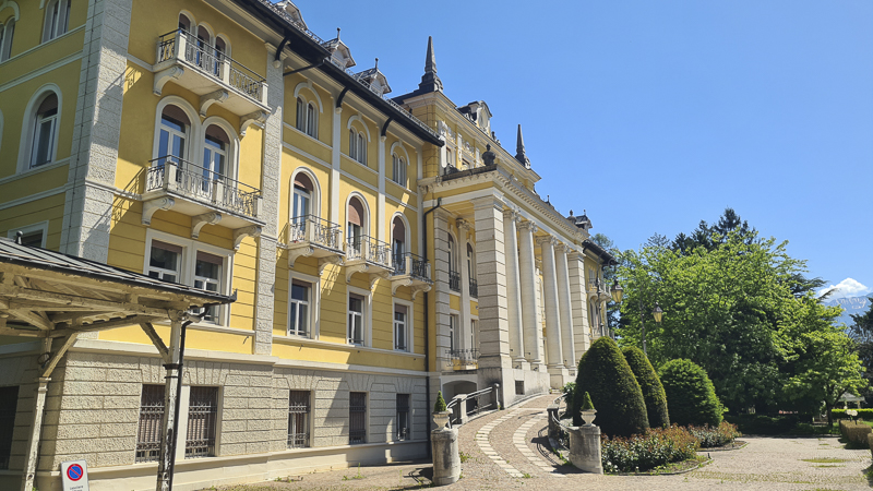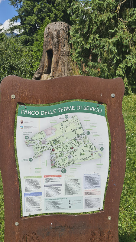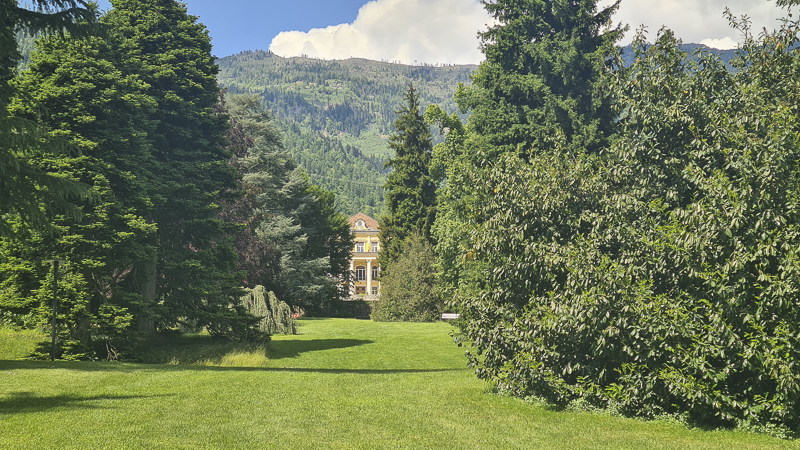 - Kurpark in Levico Terme: Alte Bäume, breite Wege, viele einheimische Hunde – und oben das imposante Grand Hotel Imperial.