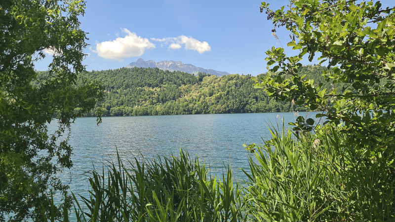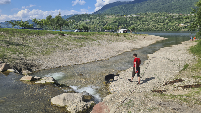 Wir wohnen mit dem Camper am Caldonazzosee – drei schöne lange Tage – am Camping Fleiola. Einer der freundlichsten, familiengeführten Campingplätze, die ich je besucht habe. Wir hatten aber auch einen sehr guten Stellplatz erwischt, gleich beim Übergang vom See zum Fluss, hundetechnisch optimal.