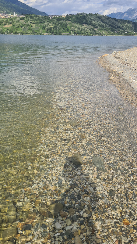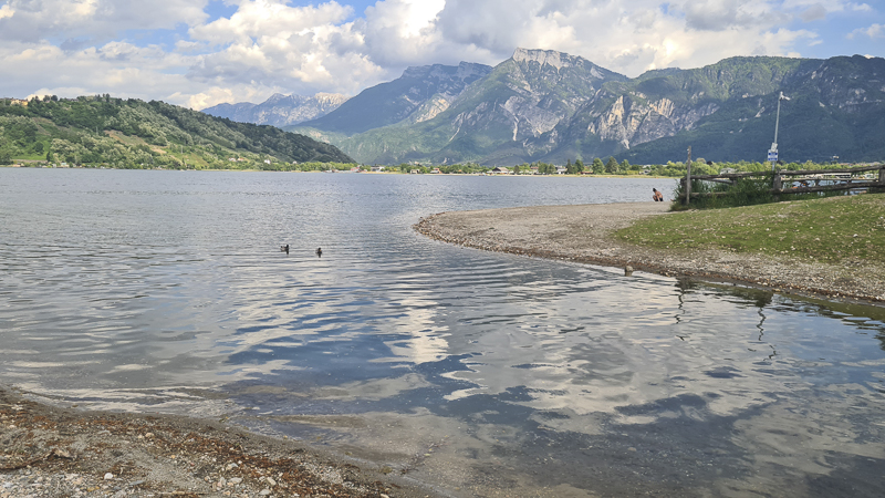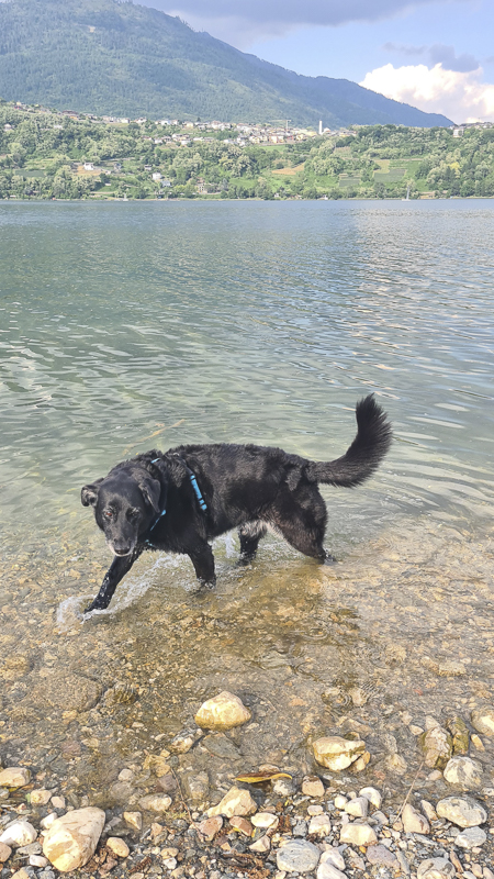 Vom Campingplatz aus kann man wirklich fast direkt an der Promenade losspazieren. Wenn man sich nicht davor scheut, ein paar Schritte durch den Fluss zu waten. So was hat uns noch nie gestört! Ohne meine Wasserschuhe geh ich sowieso nirgends hin im Sommer. Nur ein paar Schritte von unserem Super Stellplatz am Fleiola Camping Richtung See, dann über den Fluss und schon sind wir an der Promenade. Nur ein paar Minuten Richtung Süden, und man erreicht den Hundebadestrand von Calceranica, zwischen Camping Penisola Verde und Camping Fleiola. Hier darf geplanscht werden, auch wenn die Uferzone teils etwas schmal ist. Hier trifft man auch auf die Einheimischen mit Hund, einen besseren Hinweis für Urlauber am Caldonazzosee mit Hund gibts ja wohl kaum.