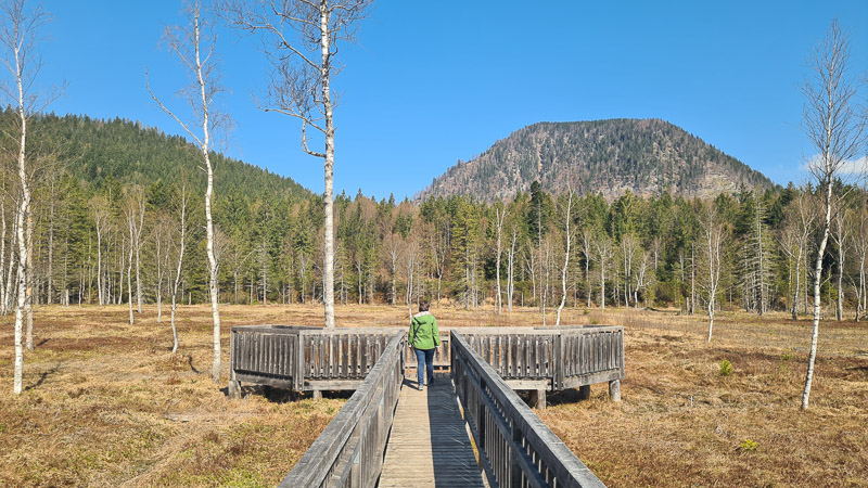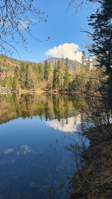 Außerhalb der Sommermonate ist es für mich ein besonderer Genuss, bei Sonnenschein am Ödensee unterwegs zu sein: Der Moor-Wanderweg, sodann der Rundwanderweg um den See und die sich im See spiegelnden Berge – das Pritscheln im Wasser – das hat man dann fast alles ganz für sich allein: Nur am neuen, großzügigen Kinderspielplatz kann es schon mal hoch hergehen, aber dafür ist er schließlich da. Hier am Ödensee waren wir schon baden, wandern und einkehren, als noch die kleine Jausenstation namens Kohlröserlhütte hier stand. Wir sind mitten in einem Naturschutzgebiet und Natura 2000 Gebiet, der Ödensee ist ein Moorsee.
