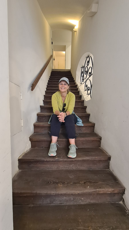 Links: Auf einer Treppe aus dem 15. Jahrhundert sitzen kann ich…