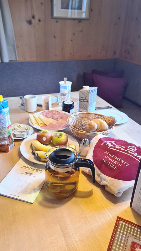 Das Frühstück bestellt man sich am Vorabend, sodass es frühmorgens dann im Baumwollsackerl – vom Hausmeister geliefert – an der Haustür baumle. Bereitgestellt wird es vom SPAR-Markt in Altaussee – außer Sonntags.