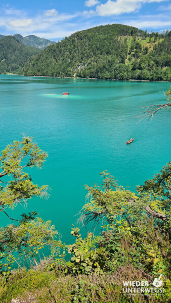 Aber dann beim Brunnwinkl beginnt der schöne Wanderweg (offiziell: Josef Ebner Weg) direkt am See entlang, eine malerische Bucht mit türkisgrünem Wasser – die erste heute für uns. Ab dem Brunnwinkel an der Seepromenade darf man dann endlich auch wildbaden. Es ergeben sich herrliche Ausblicke retour auf die Villen von Gilgen und die Bootsanlegestelle. Man sieht aufs Zwölferhorn und die Gilgener Kirche. Ab hier kann man immer wieder zum Wasser hinunter, sogar einige kleine Kiesbuchten finden sich für uns. Der vielbegangene Wanderweg ist halt immer daneben und man ist auch stets unter Beobachtung.